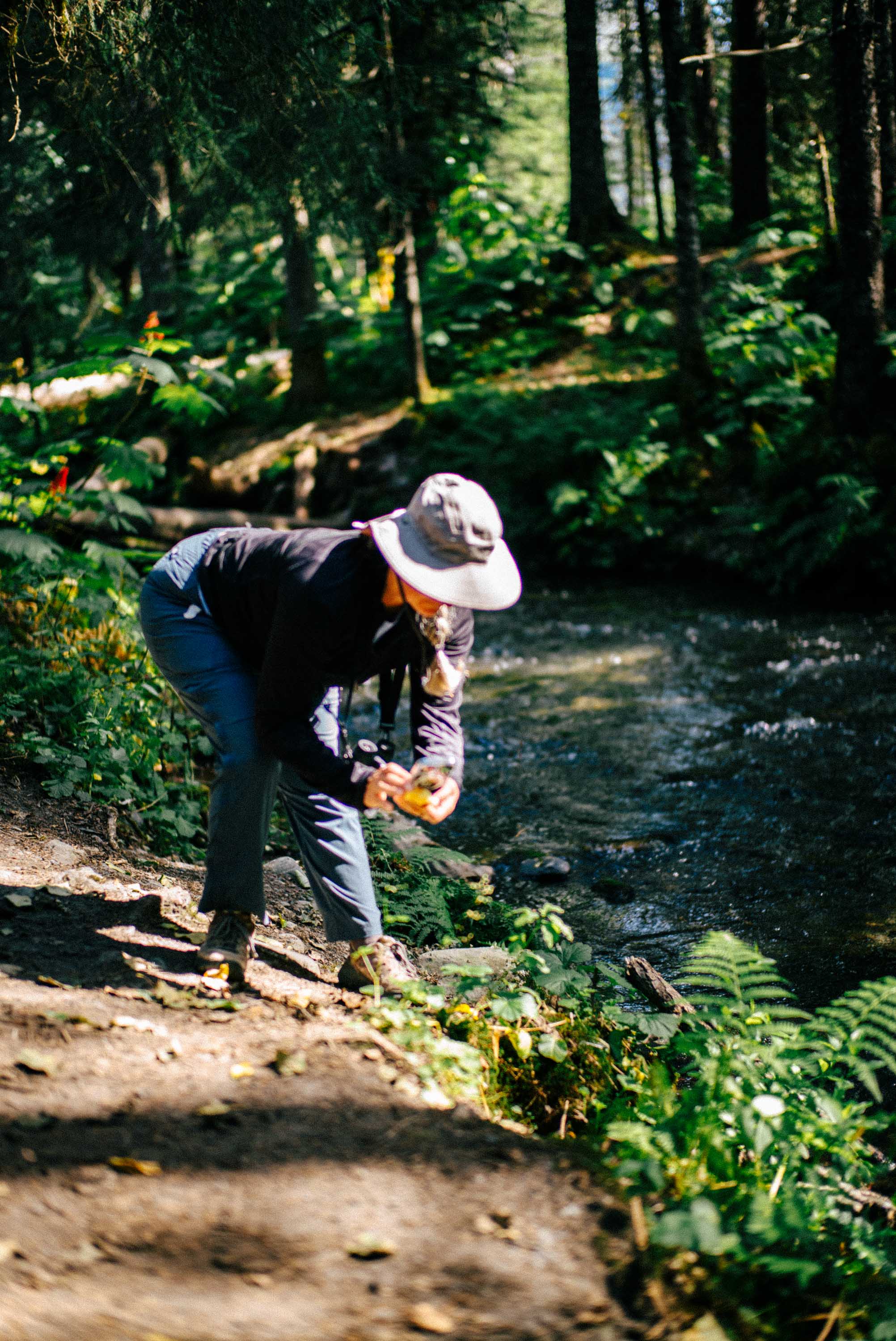 We watched this unfold through our binoculars, and though the bigger bear was a quarter mile away, the salmon run could bring her in our direction. We settled into the steep bank above the river, leaving about ten feet between us and the water’s edge below. I wanted my camera as low to the ground as possible, so I dug a small hole in the rocky sand and laid facedown toward the water.