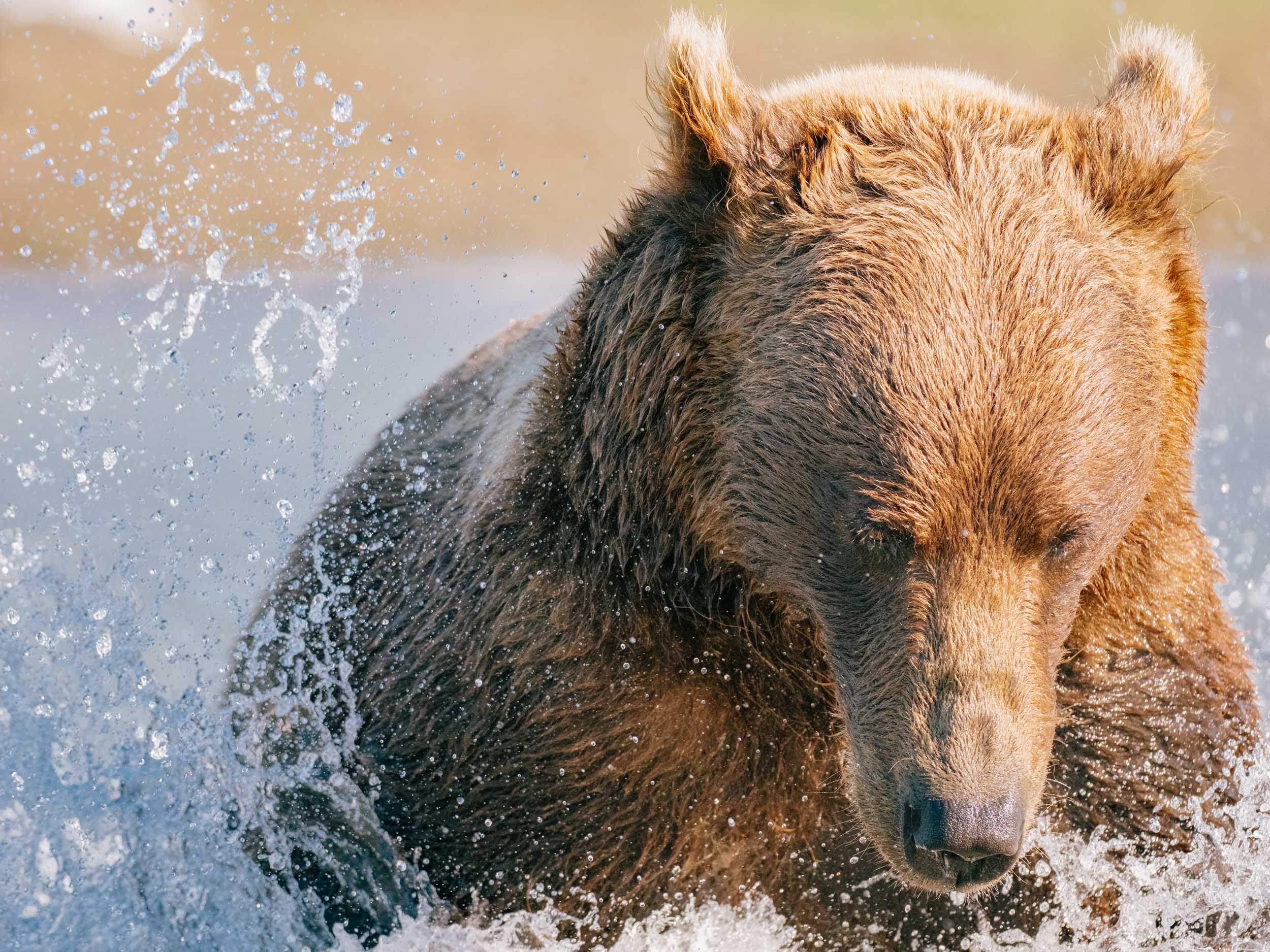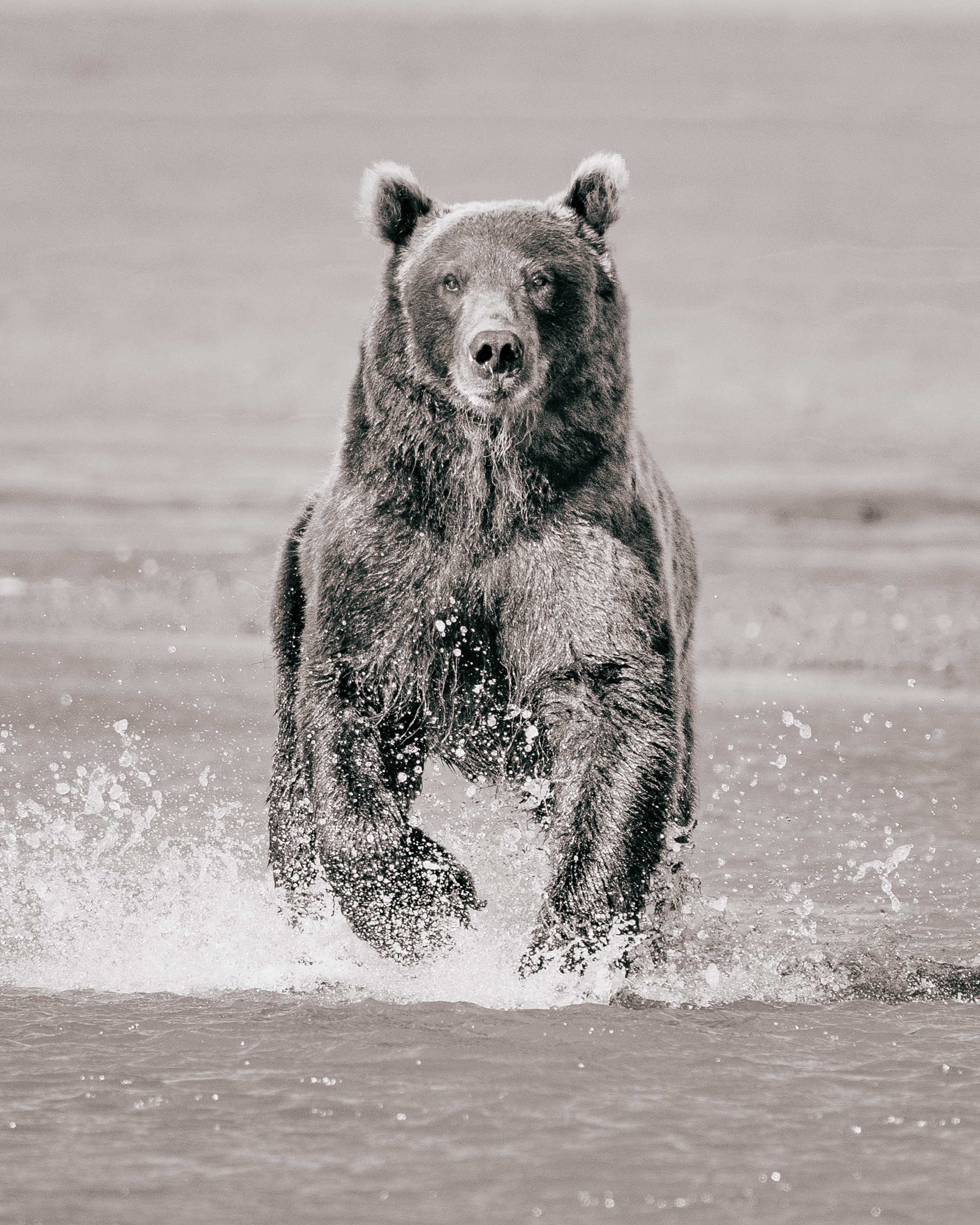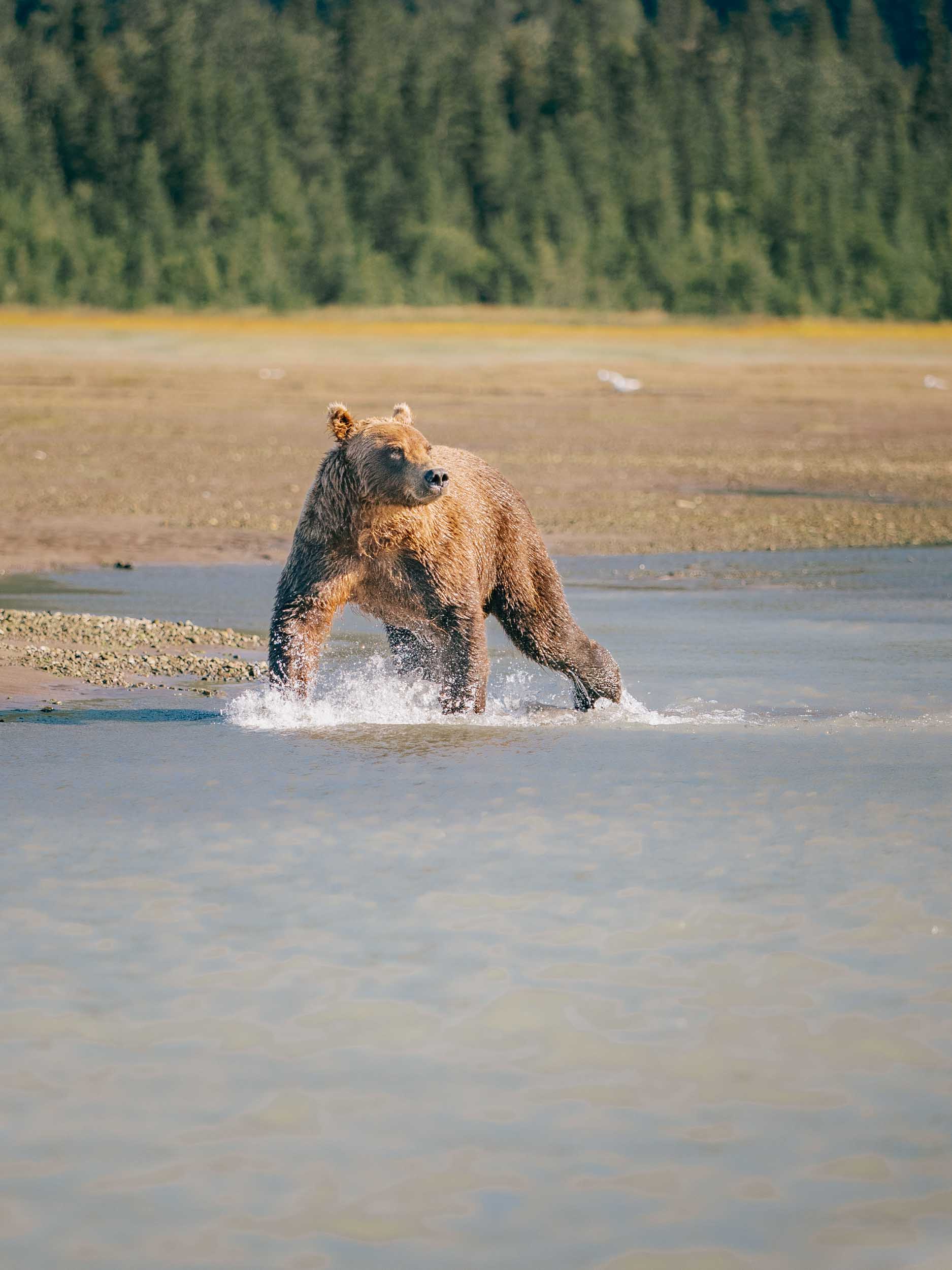 There wasn’t much waiting after that. As soon as the larger bear decided the other two youngsters weren’t going to threaten her space, she started to hunt salmon. The strategy was thrilling: to splash in the shallow water, scare salmon into jutting away, then scoop one up with massive claws and clamp down with sharp teeth in an instant. To make as big a splash as possible, she did something between a canter and fox-like pounces up and down long stretches of water. The fish were so plentiful that she would catch one, casually take a bite or two, and toss the still-flailing fish back into the water in pursuit of another.