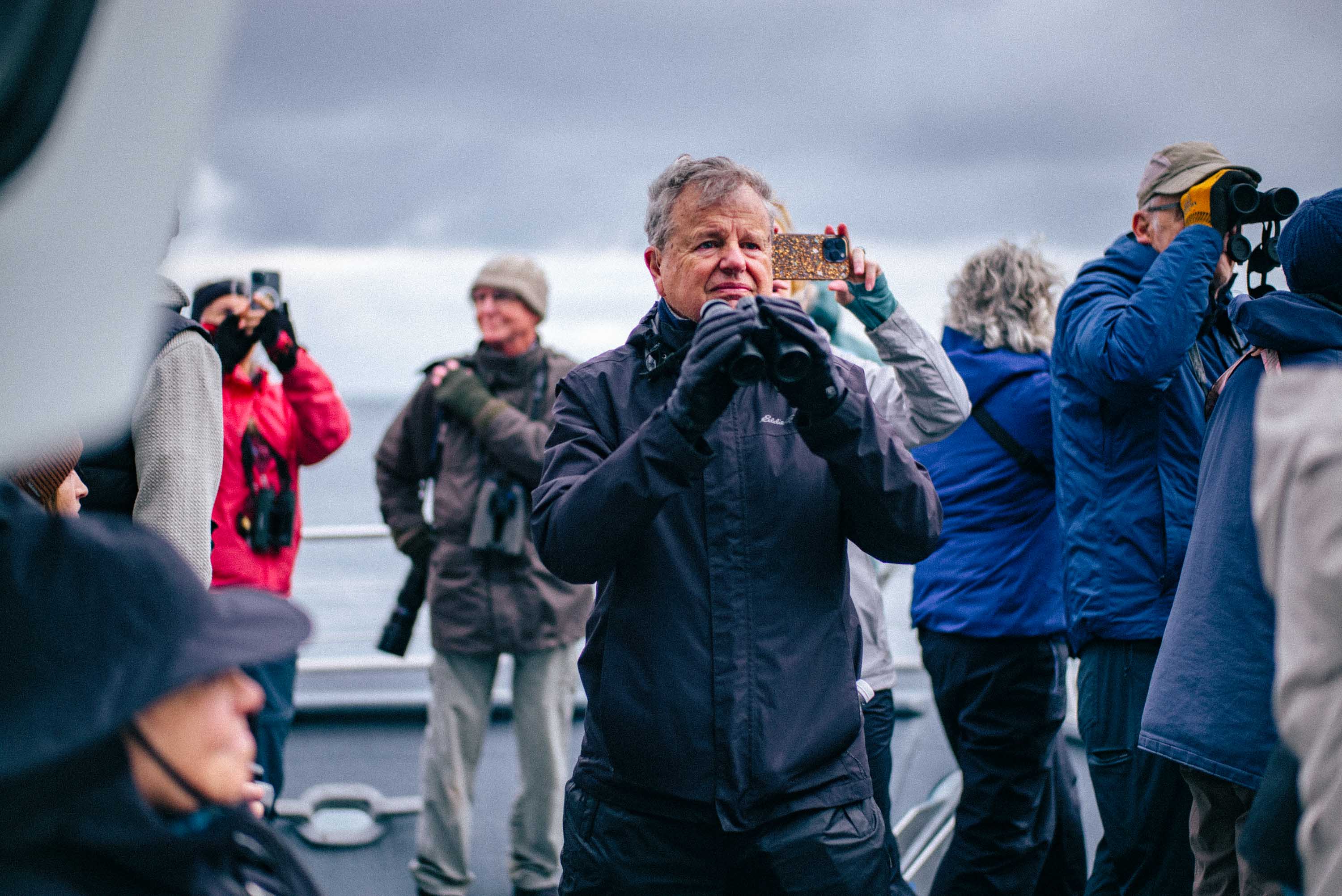 The comfort of the boat didn’t mean fewer sightings — in fact, it was one of the most exhilarating birding and wildlife viewing days I can imagine. Bird activity never stops, and on top of the baseline of Common Murres and Black-legged Kittiwakes, more species were constantly coming into sight. Alcids were the stars of the day, and we wound through multiple colonies of both Horned and Tufted Puffins. As we maneuvered through inlets, it was magical to watch both species crisscrossing just over our heads as they came and went from the towering rockfaces. We kept an eye out for Red-faced Cormorants, and even a few non-birding guests on the boat were intrigued by the hunt for this range-restricted species.