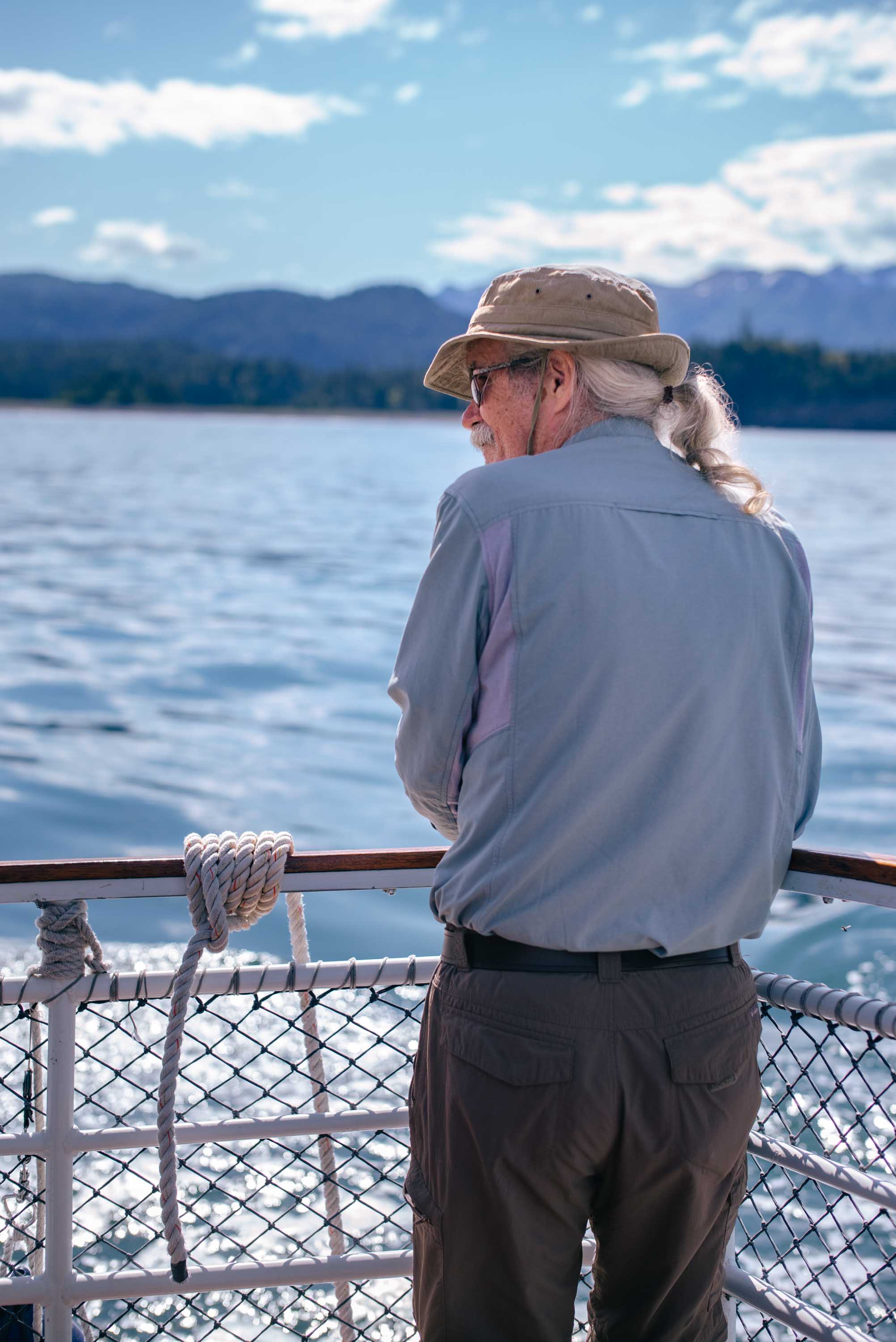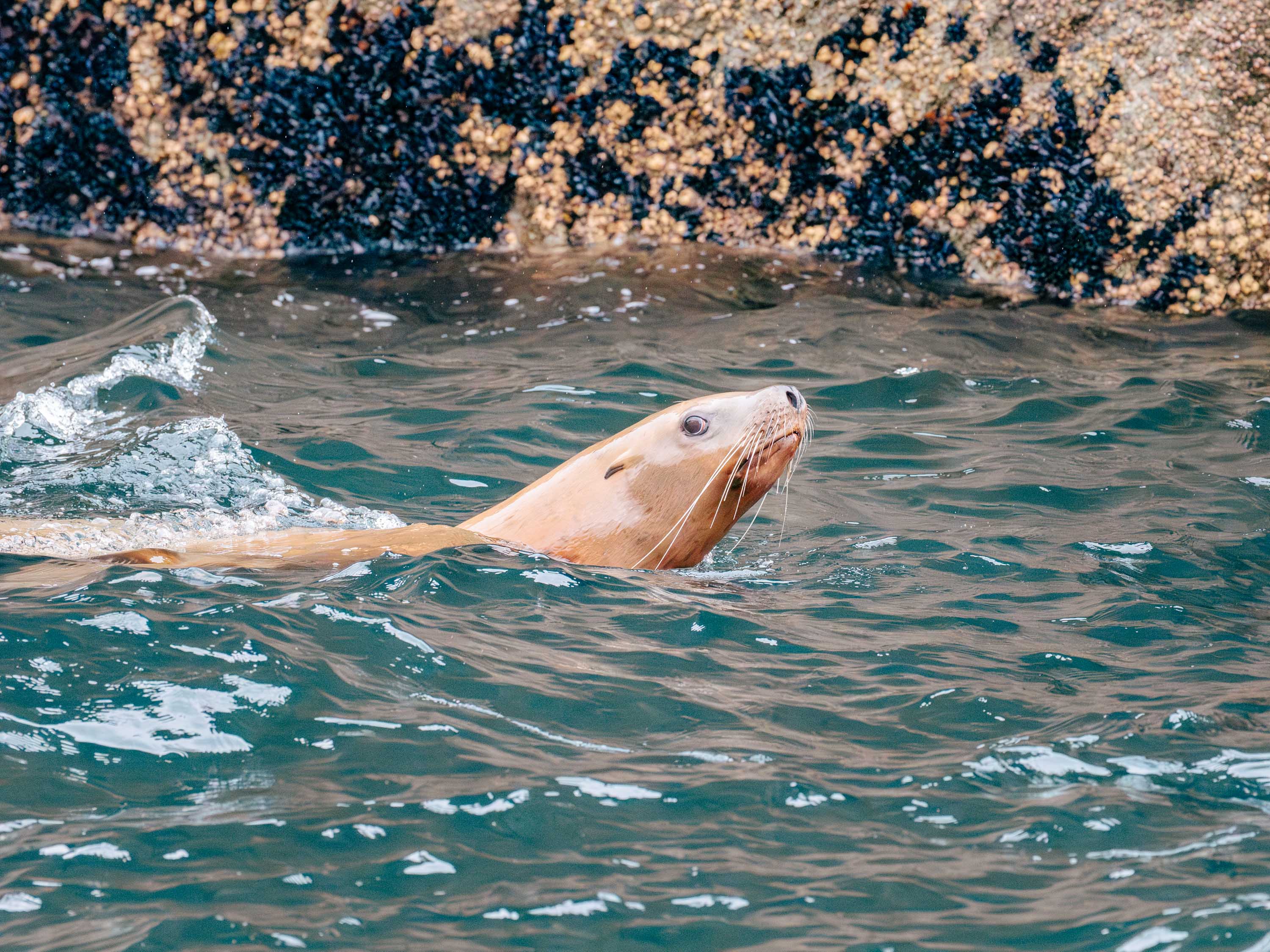 We followed a few Humpback Whales, and at one point, Dall’s Porpoises followed us to playfully ride our bow – a dolphin-like behavior that most porpoises are too shy to exhibit. A Mountain Goat family gave us perspective on the vastness of the surrounding cliffs, and more than once, we drifted past Steller’s Sea Lions lounging sleepily on the Chatham Islands.