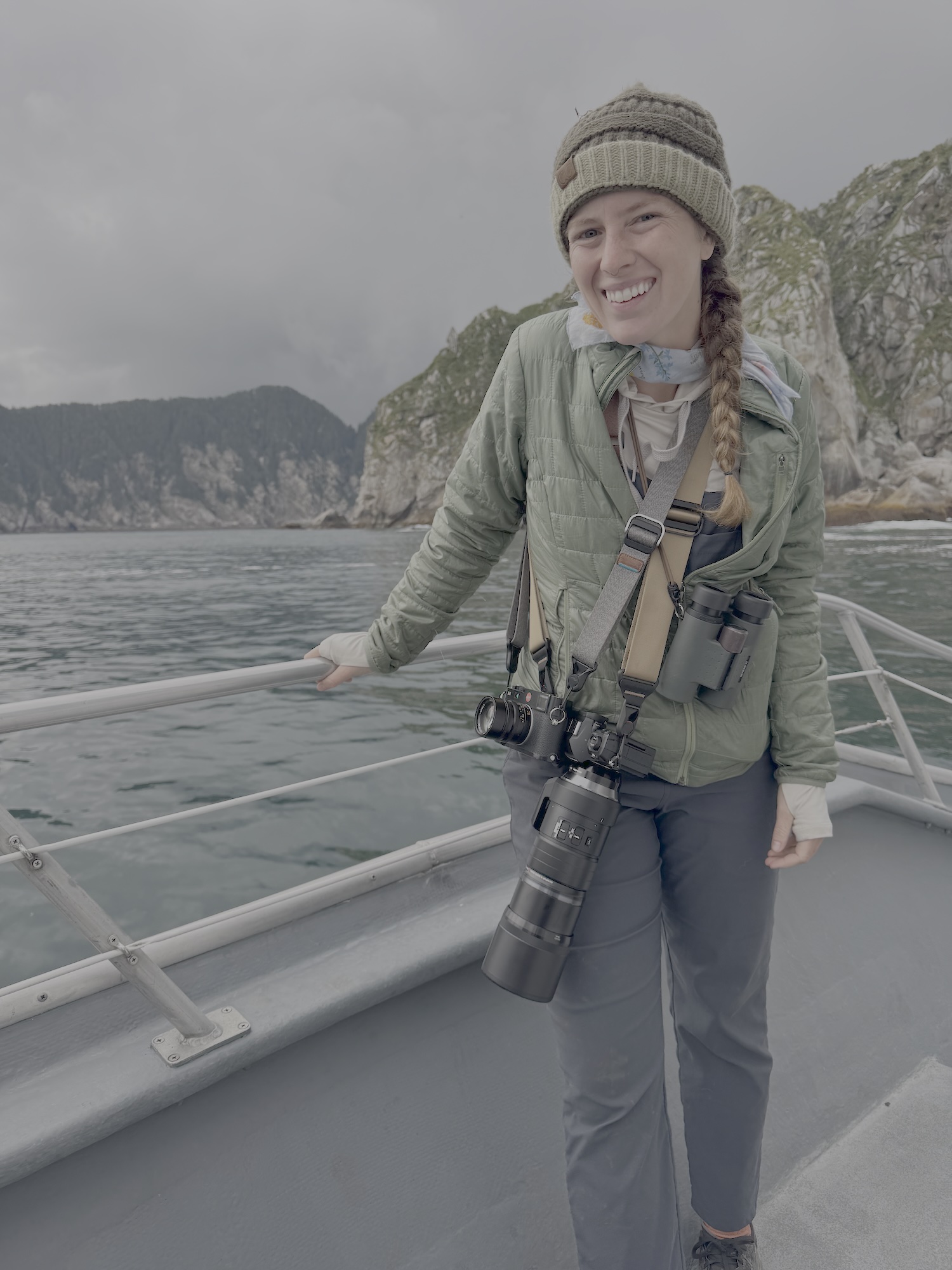 Later in the afternoon, after starting to turn back, we took one final detour to a cliff face that was alive with dozens of small cascading waterfalls. Again, we turned the boat off, so close we could almost touch the vertical wall extending into the fog and out of sight. A song sparrow darted from the lush vegetation clinging to a ledge. I didn’t know a place like that existed before seeing it myself.