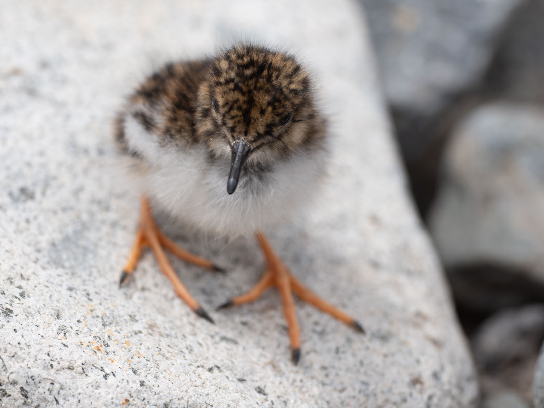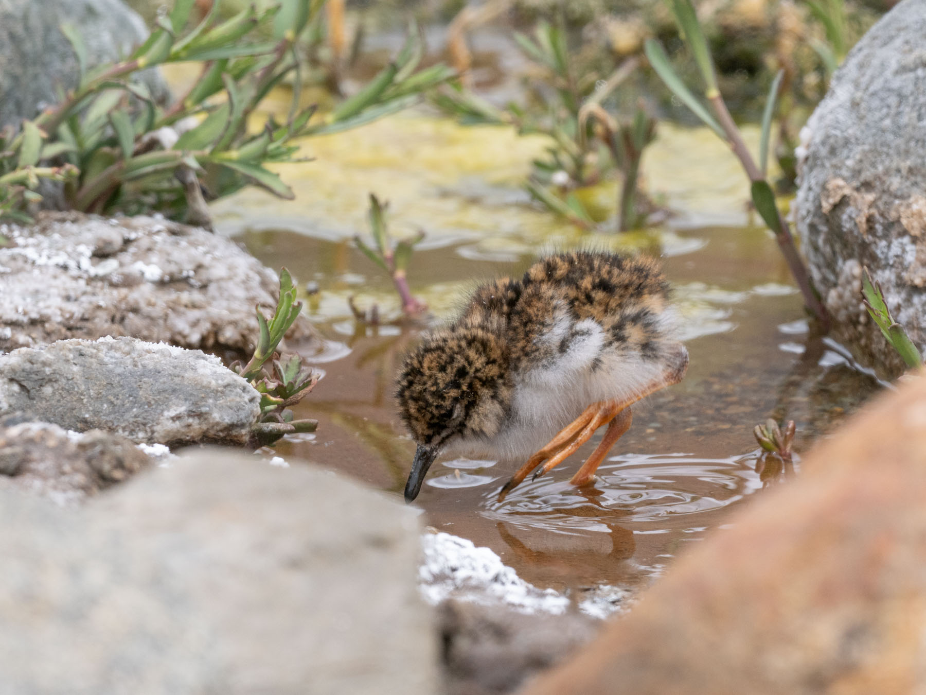 At eye level, many of the rocks were taller than the adult. She scuttled in and out of view as she approached, not probing like most plovers, but picking food selectively as she softly quipped to her trailing chicks. They were even harder to find as they wove through their habitat, but we knew they were coming, too. It wasn’t long before they were all streamside again and only a few feet from us. She was completely aware of our presence, but not deterred at all. All three resumed unbothered foraging, still inching closer.