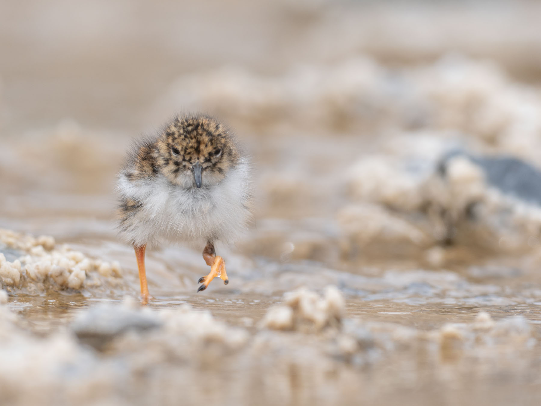 Raymond hit the brakes and eased over, and without speaking, we grabbed our optics and scurried out just as a second chick appeared. Here, in this open and rocky expanse cut by a trickling creek, this family of sandpiper-plovers fed.